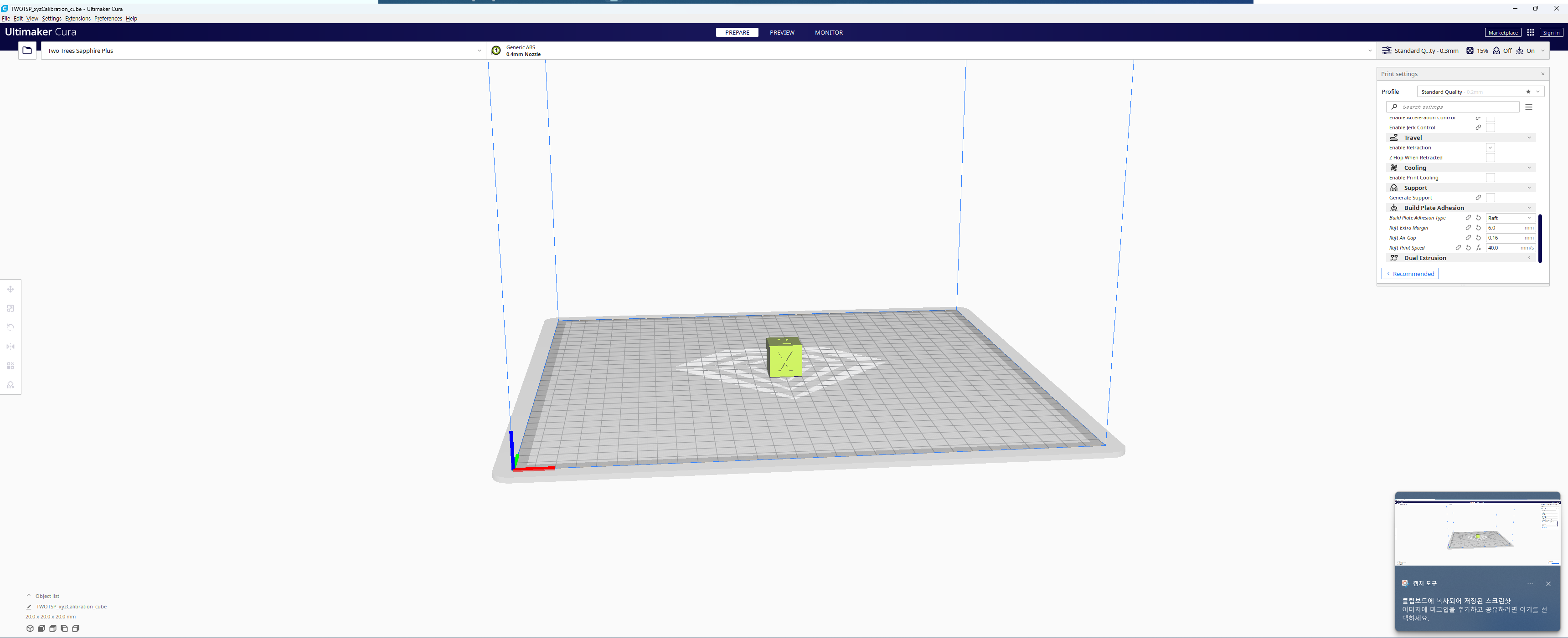 한번 테스트용 큐브를 출력해보니 삐걱이는 소리도 없고 시작도 괜찮게 나오고 있었다.