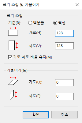 크기 조정 및 기울이기 메뉴에서 원하는 크기 설정 후 확인
