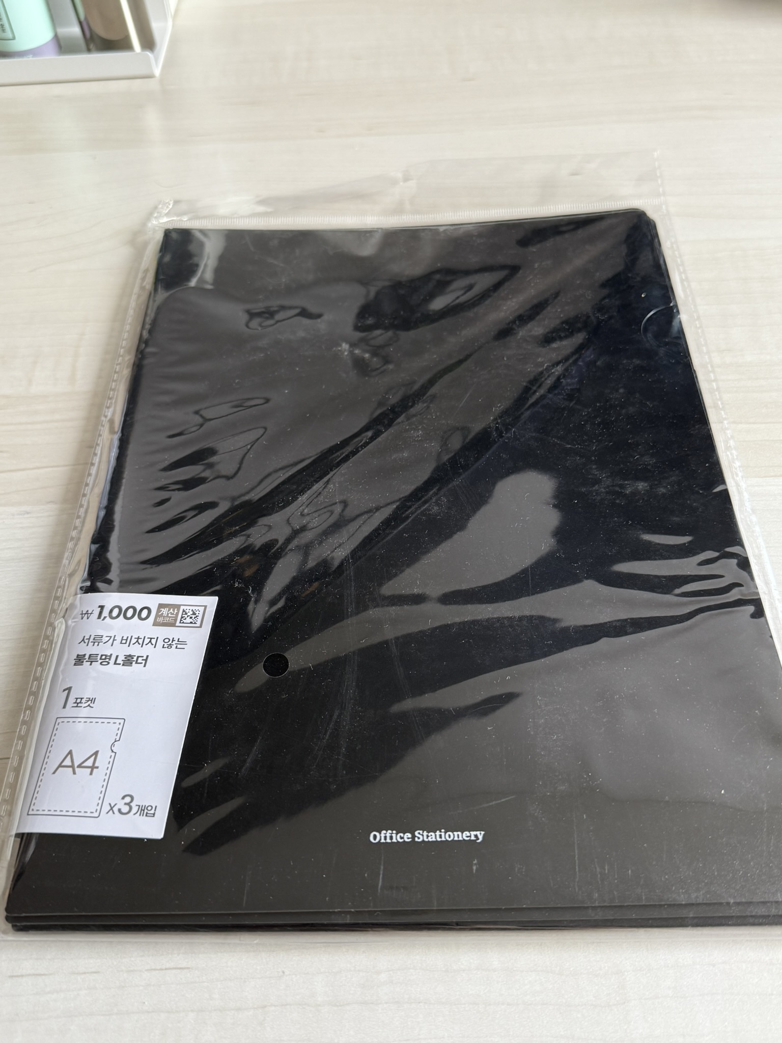 "서류가 비치지 않는 불투명L홀더" 라는 이름이고 천원에 3개가 들어있다. 혹시 자르다 실수하면 만회할 기회가 2번 더 있다.
