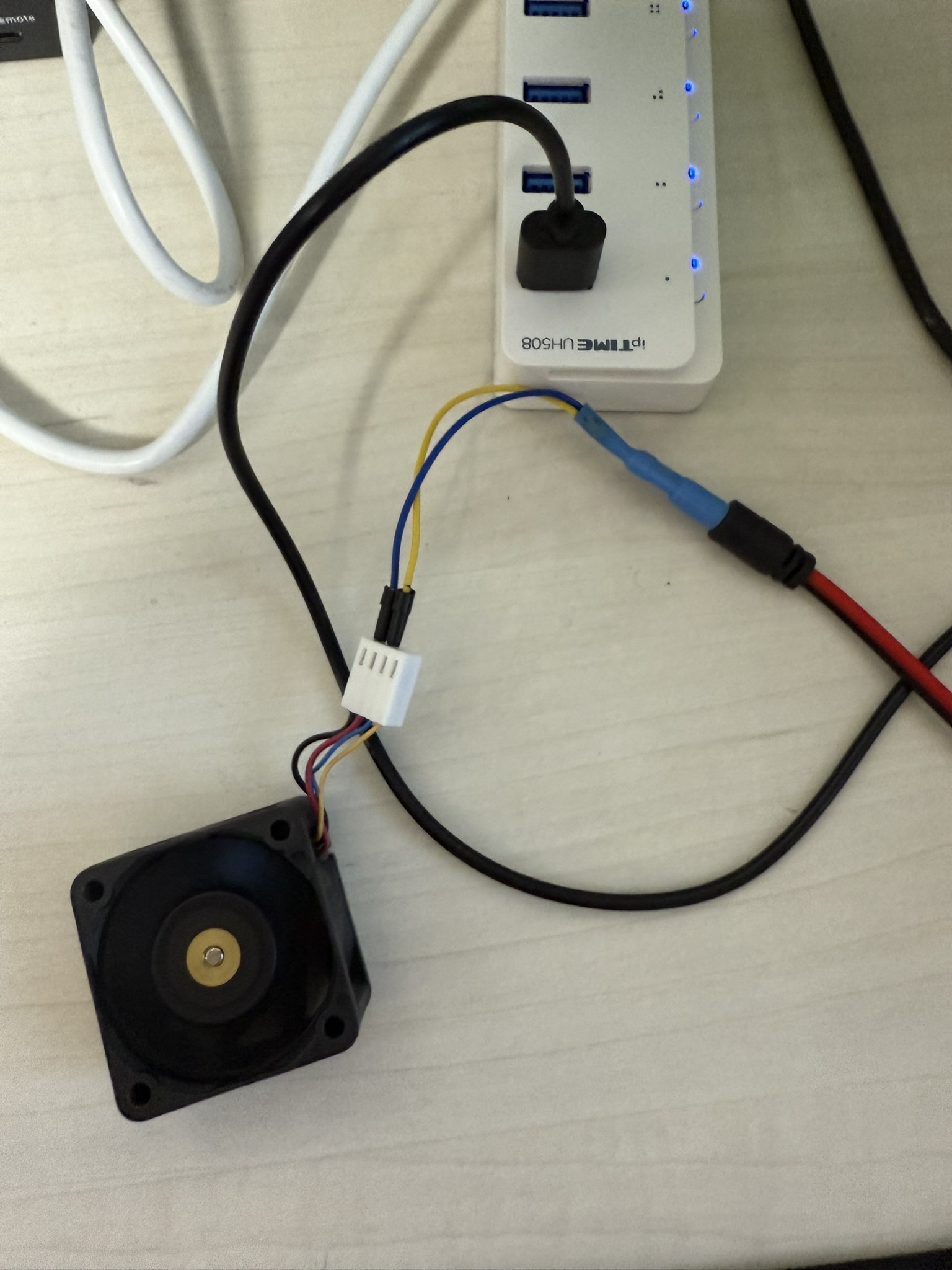 만일을 대비해서 방 안에 굴러다니는 팬과 USB선, 점퍼선들을 이어서 간이 쿨러를 만들었다.