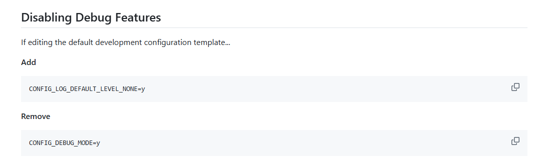 가져온 sdkconfig.default 를 편집기로 열어서 아래 안내와 같이 디버그 관련 옵션을 비활성화했더니 정상 동작했다.