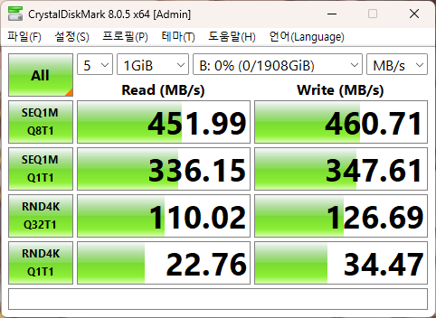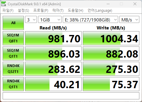 다나와에서 찾은 스펙보다는 낮게 나오는데 인클로저와 연결한 USB의 성능 차이인듯 하다.