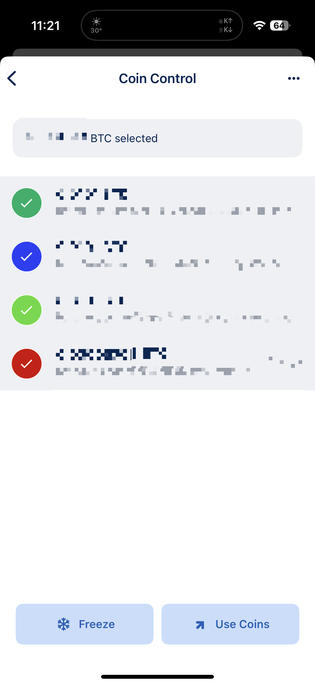 읽기 전용 블루월렛에서 send를 누르고 ... 버튼을 눌러 Coin Control을 선택한다.