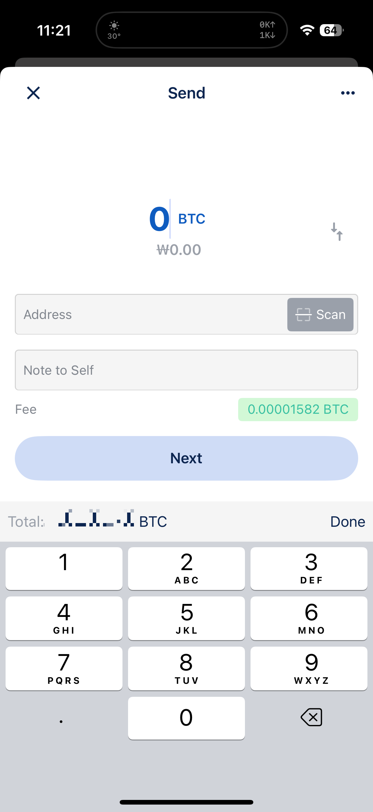 보낼 BTC 입력란을 터치해 키보드를 띄운 후 Total ____ BTC(개수) 를 선택한다. 그리고 확인을 누르면 MAX로 변해서 수수료 포함 선택한 UTXO의 모든 비트코인을 전송한다.