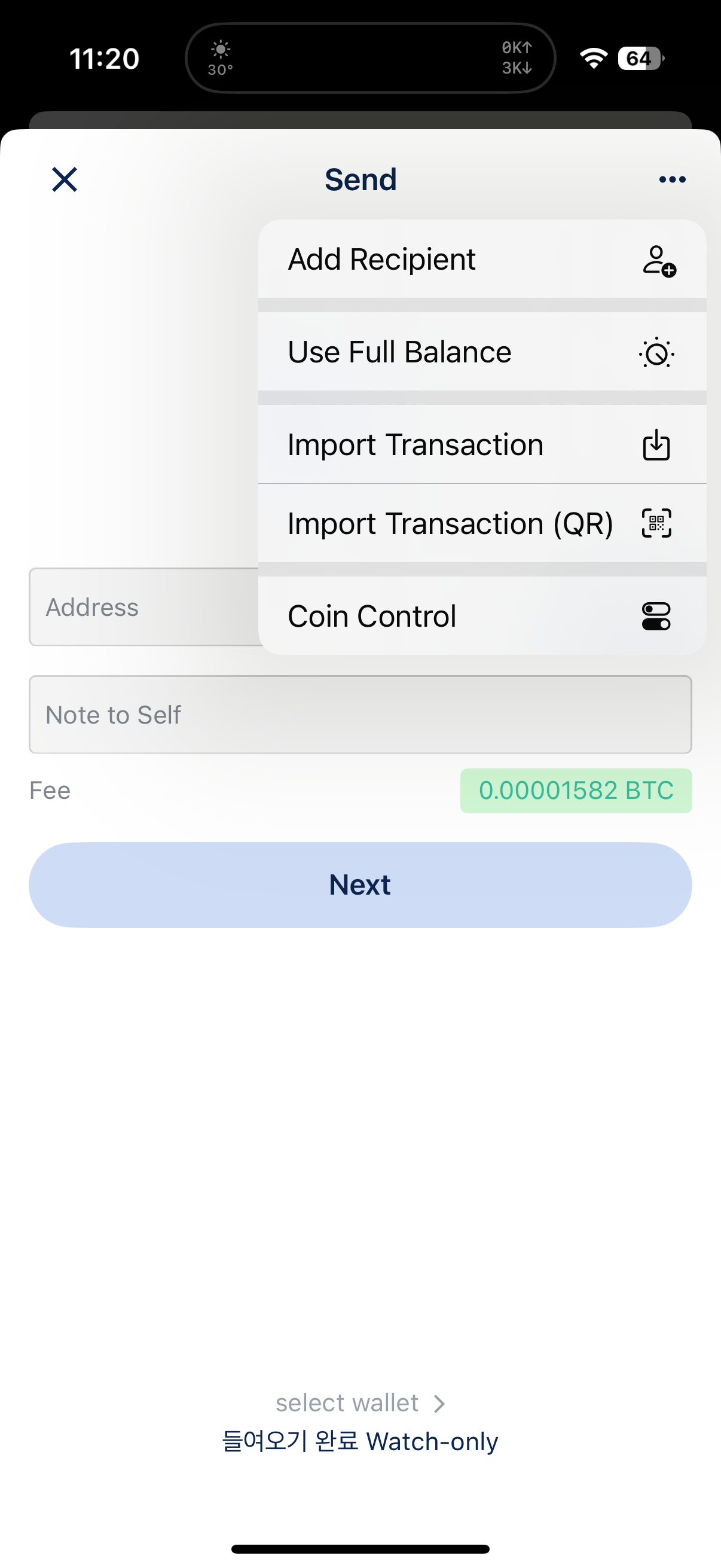 읽기 전용 블루월렛에서 send를 누르고 ... 버튼을 눌러 Coin Control을 선택한다.