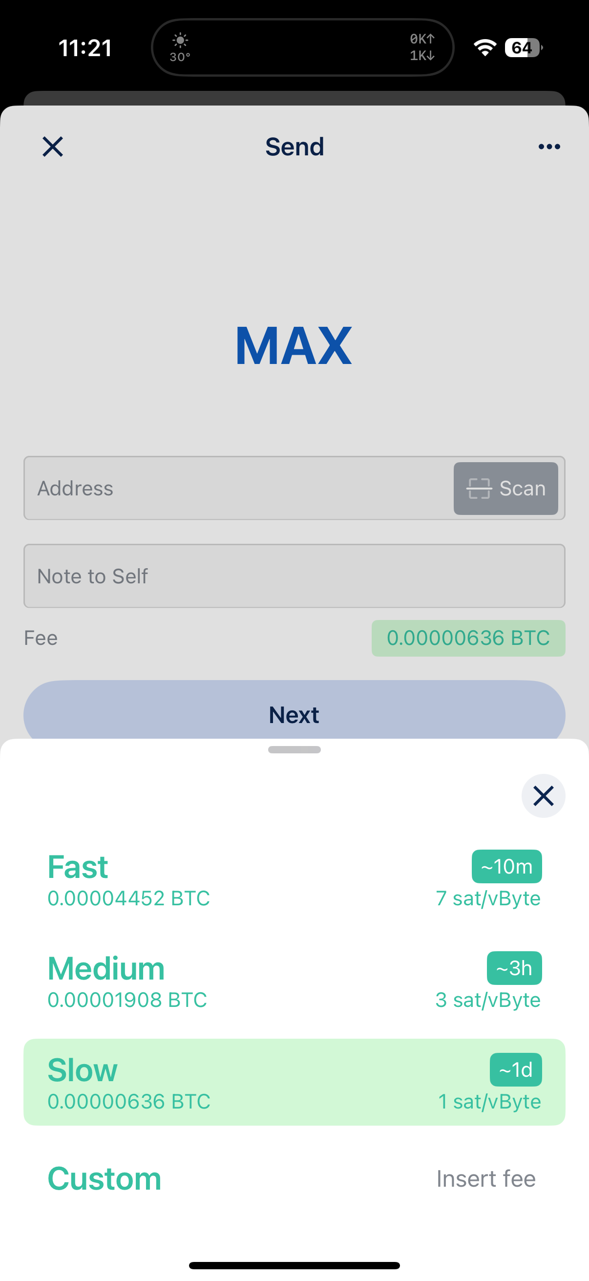 보낼 BTC 입력란을 터치해 키보드를 띄운 후 Total ____ BTC(개수) 를 선택한다. 그리고 확인을 누르면 MAX로 변해서 수수료 포함 선택한 UTXO의 모든 비트코인을 전송한다.