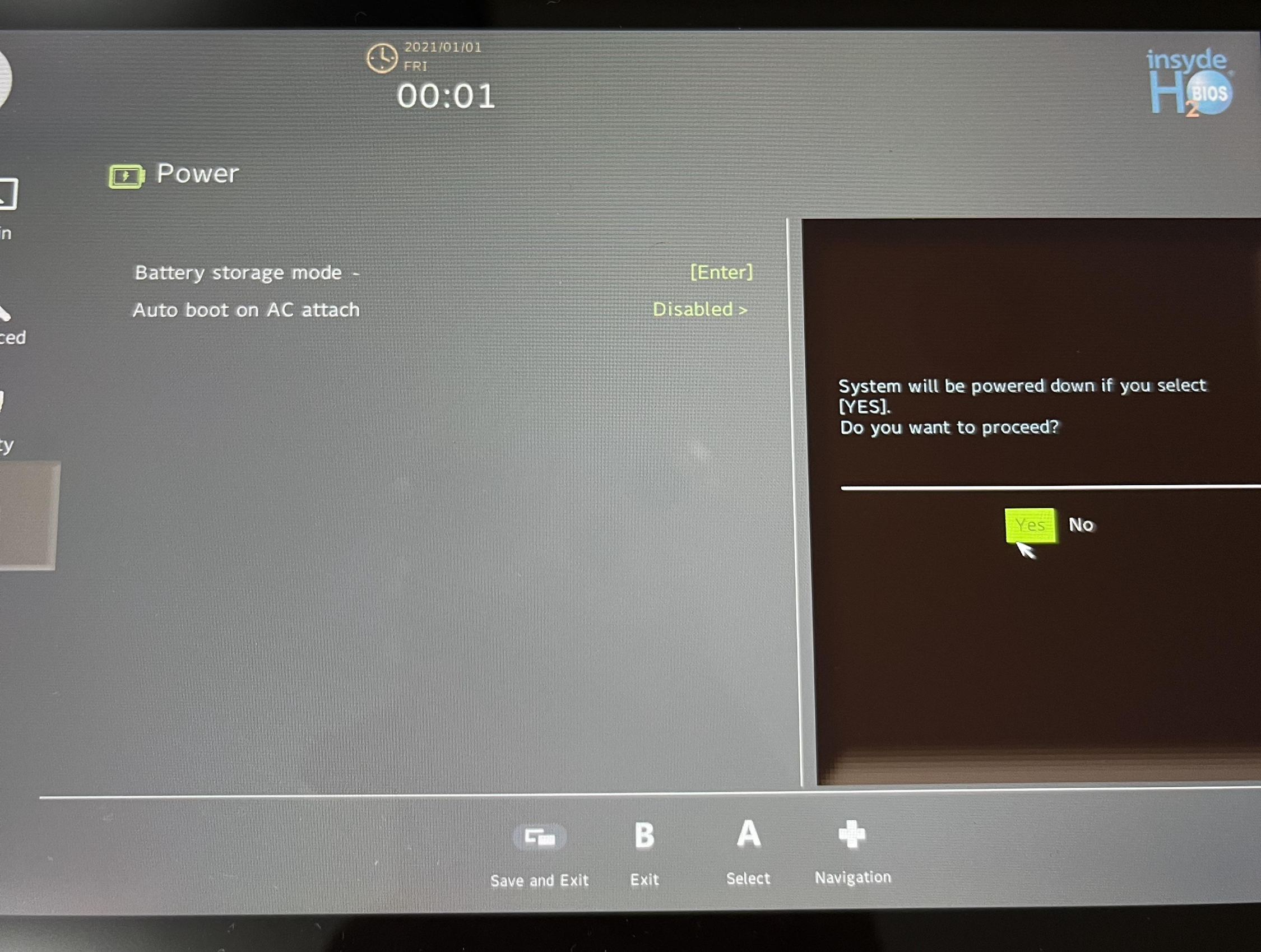 - 오른쪽 사진에서 power > Battery storage mode를 활성화한다. yes누르면 자동으로 꺼진다.