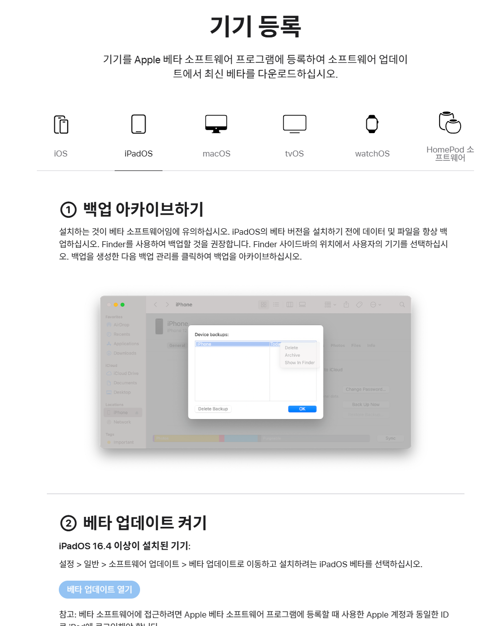 다시 패드로 가서 설정 > 일반 페이지에 있는 업데이트로 이동하면 베타 업데이트를 킬 수 있다.