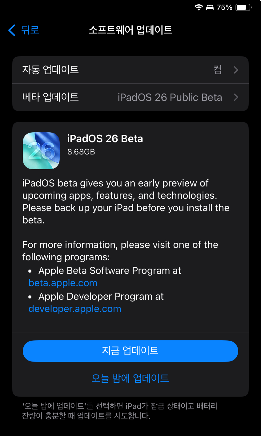 이제 아이패드에 IOS26을 설치할 수 있다.