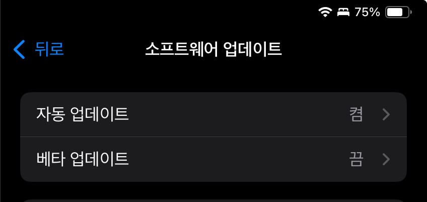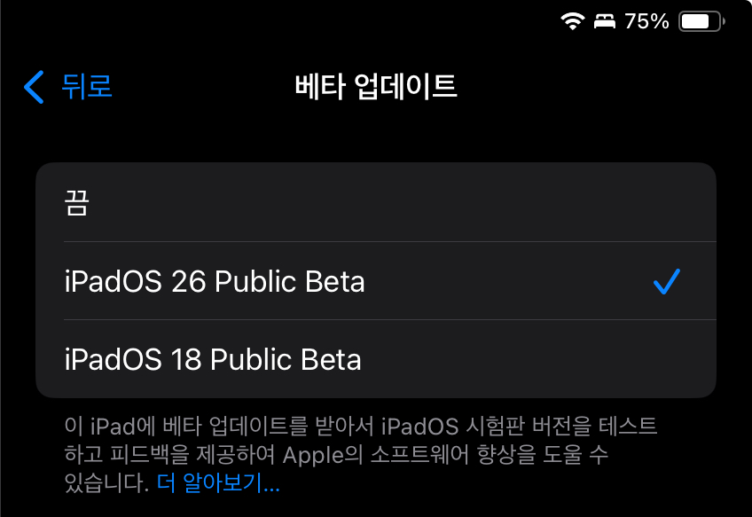 다시 패드로 가서 설정 > 일반 페이지에 있는 업데이트로 이동하면 베타 업데이트를 킬 수 있다.