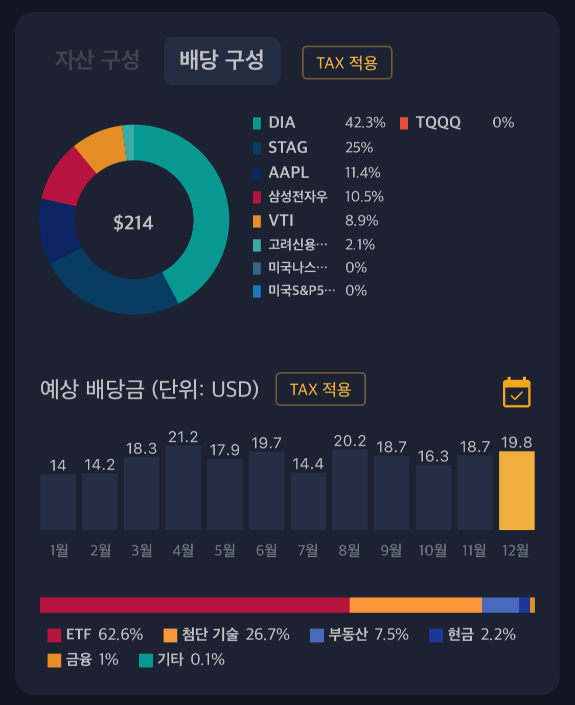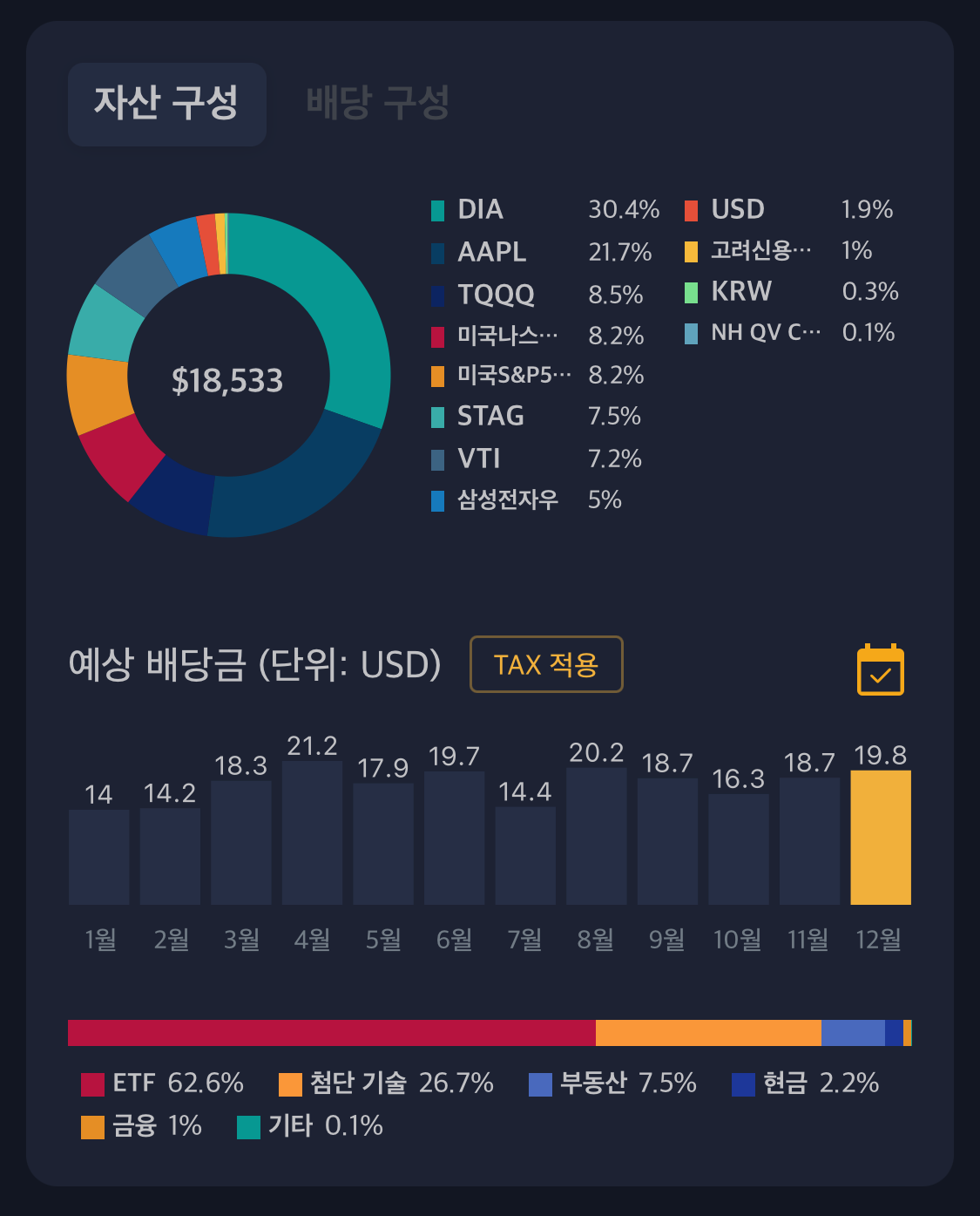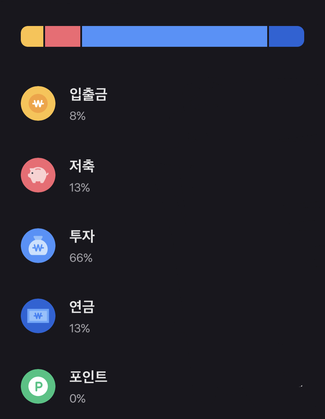 2022년 올해를 마지막으로 모은 것들을 토스와 더리치로 정리해 보았다. 지금은 개별주 몇개와 etf로 지수추종을 하고 있다. 올해 처음으로 취직했기 때문에 시작한 지는 이제 약 10달 정도 되었다. 월급의 대부분을 저축과 투자로 넣고 있다. 연금은 연금저축펀드에 미국시장지수(snp500, 나스닥100)를 사는 것을 감안하면 나는 지금 내 재산의 79%를 시장에 투자하고 있다. 해외는 크게 snp500, 나스닥 100(+tqqq), 다우산업지수(DIA), 미국시장지수(VTI) 등에 투자하고 개별주로 애플(AAPL)과 스테그 인더스트리얼(STAG)을 사고 있다. 국내는 ISA에서 삼성전자우와 고려신용정보를 적립식으로 매수하고 있다.